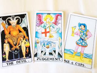 Just lay a card for the beginning, middle, and end of your story. Note, I laid all three as if in a regular 3-card spread with Beginning on the Left, Middle in the middle, and Ending on the Right – as shown below in the picture. Also, I used what I had gathered from the above Character creation exercise…meaning, this is the beginning, middle, and end of their story – not just a random plot. Okay, then here we go.